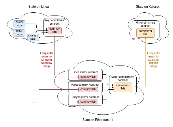 因此,有一个结构可以继续将值添加到不断增长的列表的末尾,但有一定的大小限制。然后,使用这个结构作为数据结构(i)对每个 L2 上的密钥列表的承诺,存储在该 L2 上并镜像到 L1,以及(ii)对 L2 密钥承诺列表的承诺,存储在以太坊 L1 上并镜像到每个 L2。