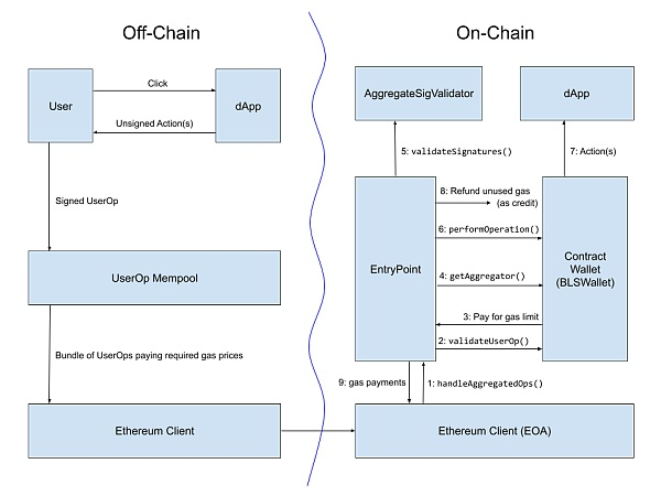 从实施的角度来看,让捆绑者通过 ERC-4337 账户抽象标准聚合跨链证明可能是最好的。ERC-4337 已经有一个机制,让构建者以自定义的方式聚合 User Operations 的部分。甚至有一个针对 BLS 签名聚合的实现,这可以将 L2 的 Gas Fee 降低 1.5 倍到 3 倍。