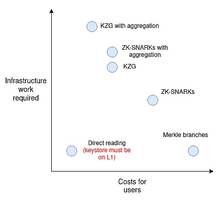 如果使用 ZK-SNARKs,每个用户可能需要花费几千个 L2 Gas Fee。如果使用 KZG 多重证明,验证者需要为该区块内使用的每个持有钥匙库的 L2 增加 48 个Gas Fee。