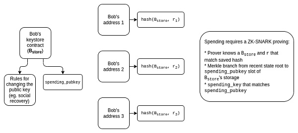 这个分离架构的结构是:每个用户都有(i)一个「密钥存储合约」(在 L1 或特定的 L2 链上),它存储了所有钱包的验证密钥以及更改密钥的规则,以及(ii)在 L1 和许多 L2 链上的「钱包合约」,它们通过跨链读取来获取验证密钥。