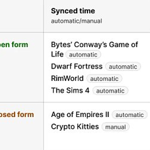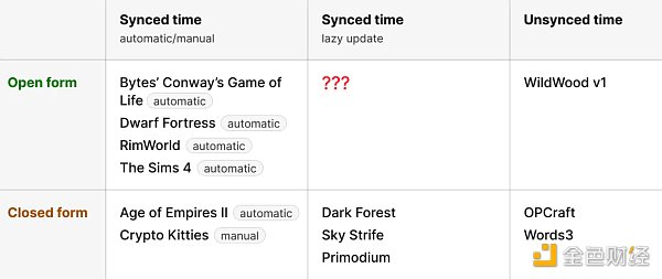 开放和封闭形式之间的权衡涉及到一个与时间相似的平衡。封闭形式可能会降低世界的潜在趣味性,但它们也使其更具计算效率。封闭形式可以与同步或异步时间一起使用。在区块链上实现时,他们在时间同步时对开放形式有显著的优势。因为任何长度的时间的成本是恒定的,所以世界可以被设计为只在用户发送交易时更新链上状态,但它被设置为在上次更新后的时间流逝后的状态。