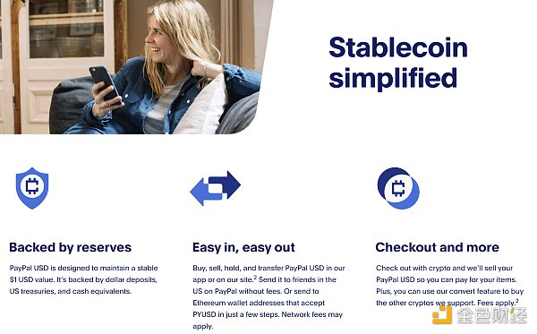 而PYUSD 是一个极其重要的发展,因为它使 PayPal 成为目前采用公共区块链技术的主要金融机构中的领导者。该代币已经在以太坊区块链上上线,由 Paxos 发行,Paxos 是稳定币行业的资深人士,还负责币安的 BUSD 和名为 PAXG 的黄金支持的稳定币。有趣的是,在纽约金融服务部指出“与 Paxos 对其与币安关系的监督有关的几个未解决的问题”之后,Paxos 被勒令停止发行 BUSD。鉴于 PayPal 在美国的地位和在金融科技领域的悠久历史,这种合作关系不太可能出现类似的命运。此外,该代币 100% 由美元等价物支持,包括国库券和现金存款,并且可以 1:1 兑换为美元。