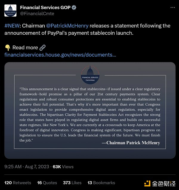 众议院金融服务委员会主席Patrick McHenry表示:“这一声明是一个明确的信号,表明稳定币——如果在明确的监管框架下发行——有望成为我们 21 世纪支付系统的支柱”。他表示,PayPal 的稳定币使得继续推动立法“比以往任何时候都更加重要”,尽管人们普遍预计这一举措在参议院受到阻力时会遇到巨大阻力。