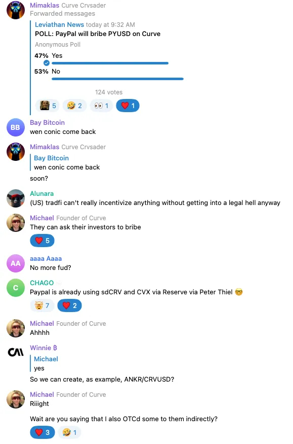 如果 Michael 的愿景得以实现,Curve 将成为外汇市场的领导者。PYUSD 只是市场上成千上万种国际稳定币货币中的一种。交易者将需要流动性,而在 Curve 上获得流动性则需要贿赂。如果 PYUSD 确实实现规模化,非美国的 PayPal 子公司进入 Curve 战争并不是那么荒谬。