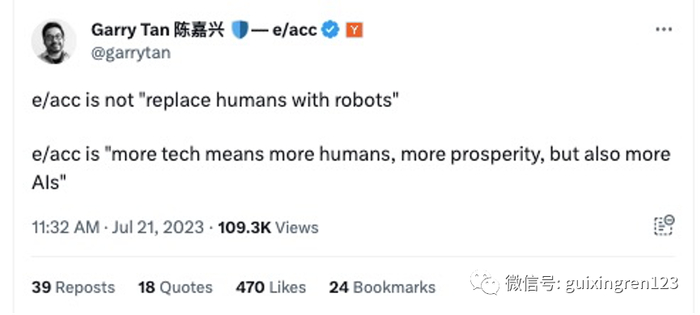 Garry Tan写道,“e/acc 并不是意味着要用机器人取代人类,e/acc意味着更多的科技将带来更人类化的东西、更多的繁荣以及更多的人工智能。”