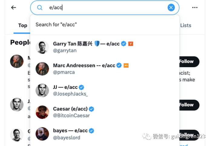 比如,A16Z的创始人Marc Andreessen和YC孵化器的CEO Garry Tan就率先把自己社交账号的名字的后缀加上了“e/acc”。在Reddit、Spaces等社区里,大家都讨论得热火朝天,在Twitter(现在的X)等社交平台上随手搜一下“e/acc”,会发现有很多人都已经在自己的名字后边加上了这几个字母。