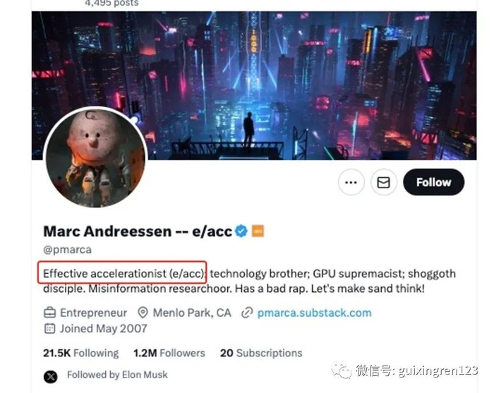 在人工智能威胁论被大量讨论的当下,“e/acc”对于推动人工智能技术发展的坚定立场和社会畅想也得到了一众大佬的响应。比如,硅谷著名风投A16Z创始人Marc Andreessen的Twitter主页介绍的第一条,就明确表示他是一个“有效加速支持者”。