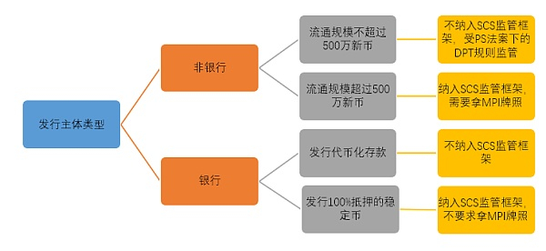 其次,在发行主体上,MAS 进行了重大调整。MAS 将稳定币发行主体分为两大类:银行和非银行。对于非银行发行者,MAS 要求只有流通规模在 500 万新币以上的稳定币才纳入稳定币监管框架,并且需要申请 PS 法案下的 MPI 牌照;否则不属于稳定币监管范畴,只需要满足 PS 法案下的 DPT 规定。对于银行,MAS 原计划将代币化存款纳入稳定币范畴,但两者在资产性质上差距巨大(存款是银行准备金制度下的产物,非 100% 抵押,且属于银行负债),最终将其剔除,因此银行也必须发行 100% 资产抵押的稳定币,但需要注意的是,银行并不需要申请 MPI 牌照。MAS 给的解释是银行法案已经要求银行满足相关标准。