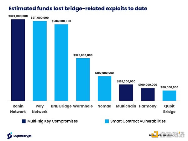 到目前为止,桥梁已经促进了大量资本的转移——2022 年 1 月,桥梁的 TVL 达到了 600 亿美元的峰值。由于面临如此多的资本,桥梁已成为漏洞利用和黑客攻击的主要目标。仅 2022 年,多重签名密钥泄露和智能合约漏洞就造成了 2.5b 美元的损失。每年 4% 的资本损失率对于金融体系的繁荣和吸引更多用户来说是站不住脚的。