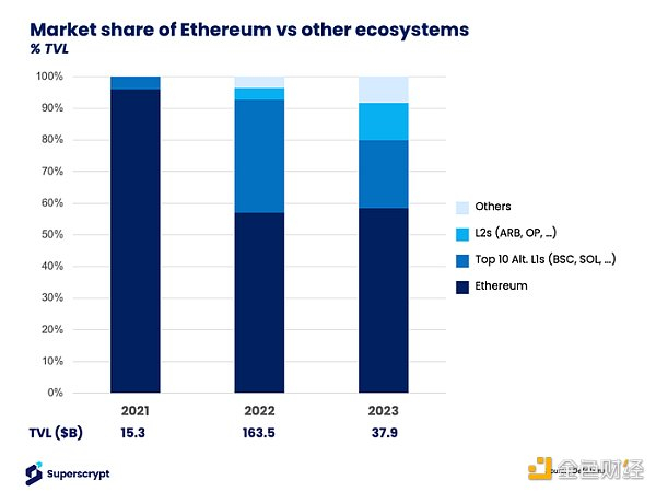 第一个公共区块链比特币于 2009 年推出。根据 DeFiLlama 的数据,自此之后的 14 年里,公共区块链出现了寒武纪大爆发,目前数量已达 201 个。虽然以太坊在链上活动中占据主导地位,2021 年约占总锁定价值 (TVL) 的 96%;过去 2 年,随着 BN Smart Chain (BSC) 和 Solana 等替代性第 1 层区块链的推出,以及 Optimism、Arbitrum、zkSync Era、Starknet 和 Polygon zkEVM 等第 2 层区块链的出现,这一数字下降至 59%。