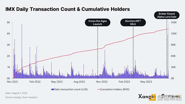 自IMX代币推出以来,交易量和持有者数量都在稳步增长。值得注意的是,交易量的激增与备受瞩目的游戏或NFT的推出同时发生,并为该平台带来了新的持有者。最近一次交易激增发生在 7 月 31 日,当时RPG游戏Ember Sword推出了Alpha Land Sale。Ember Sword引起了广泛关注,仅alpha游戏测试就有来自 50 多个国家的12,000名玩家参与。