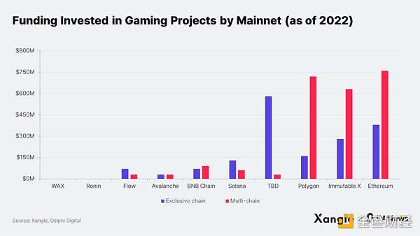 Immutable是行业内头部Web3游戏项目,该平台通过预构建的解决方案简化了Web3游戏的创建流程。在2021年4月主网上线后,Immutable平台上发布的如《Gods Unchained》和《Illuvium》游戏的数据表现一直保持在较高水平。Immutable的增长是显而易见的,其与主流Web2娱乐公司建立了一系列合作伙伴关系,其中最著名的是Gamestop、Disney和 Tik Tok。在2022年,大部分区块链游戏资金流向了以太坊、Immutable 和 Polygon,显然加密风投和游戏开发商在Immutable压了重注。