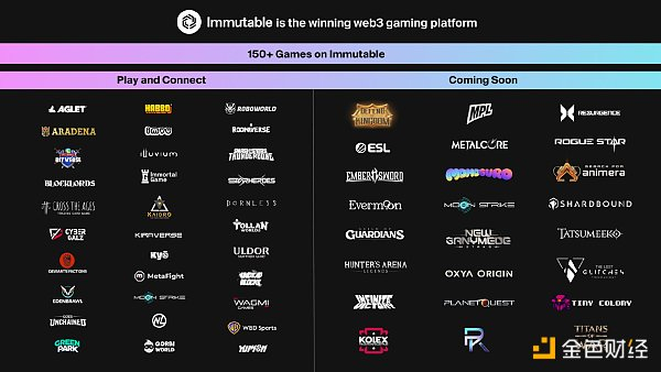 上述提到的优势有利于将众多游戏引入其平台,而Immutable自己也在开发Web3 游戏。除了 Web3游戏外,Immutable 还与 GameStop、Warner Games、iLogos和Mineloader等头部 Web2公司合作,将 Web2游戏引入该平台。这些新增内容包括拥有700万月活跃用户的 IMVU、在App Stor 中稳居第一的 Cross the Age、Undead Block、Kiraverse(测试版)、Aglet 和 Immortal Game。