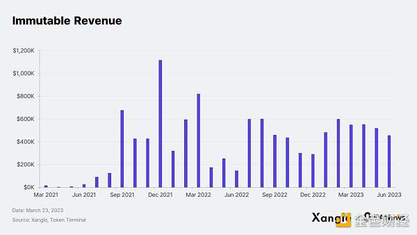 基于前面提到的优势,Immutable已经推出了 Gods Unchained 和 Illuvium 等游戏,这两款游戏都产生了稳定的收入。Immutable的收入在2021年12月达到约100万美元后,在2022年第二季度大幅下降,但此后已经恢复,其过去一年创造了50万美元的收入。由于Immutable将 NFT 交易量的 2% 确认为收入,这也表明 Immutable 平台上的活动水平较高。