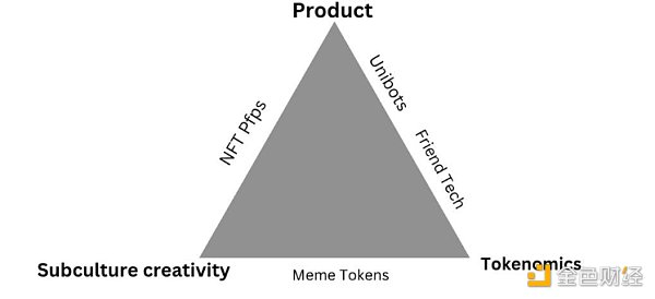 如果我们将产品力、亚文化创造力和好的token模型三点视为一个三角形(你们币圈最喜欢三各种三角形比喻),成功的项目通常要拥有其中至少两个,一个项目要能获客并且和长期生存,同时具备三个元素是必要的。