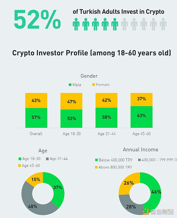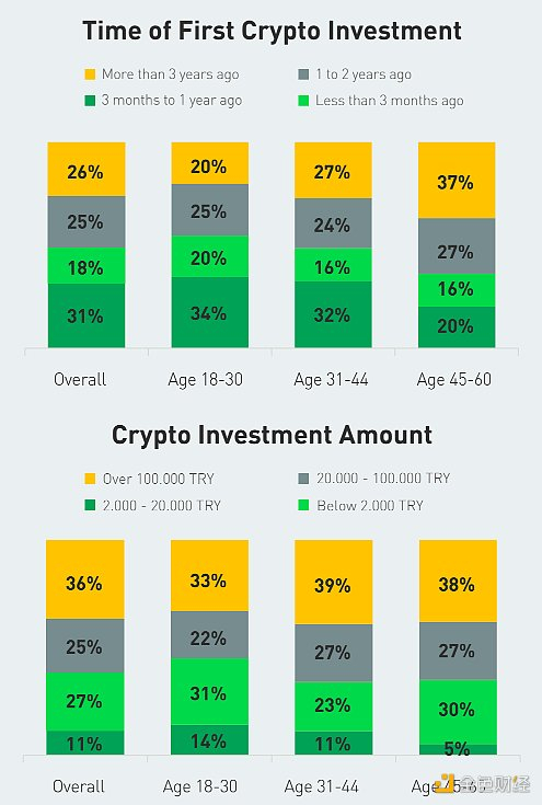 另一方面,在 45 岁以上的老年投资者中,有 37% 的人投资加密货币超过三年。调查还显示了投资金额的差异。尽管在加密投资方面经验不足,但相当大比例( 33% )的 30 岁以下年轻投资者投资超过 10 万里拉(注:约 3735 美元)。年轻投资者日益增长的兴趣和老一辈的参与进一步突显了土耳其对加密货币的接受程度不断提高。