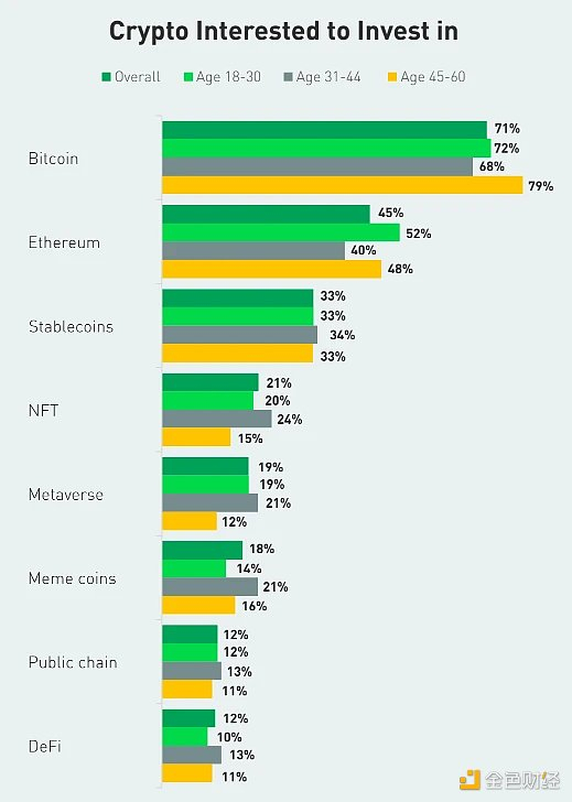 以太坊排名第二, 45% 的投资者和 52% 的年轻投资者表示有兴趣投资它。