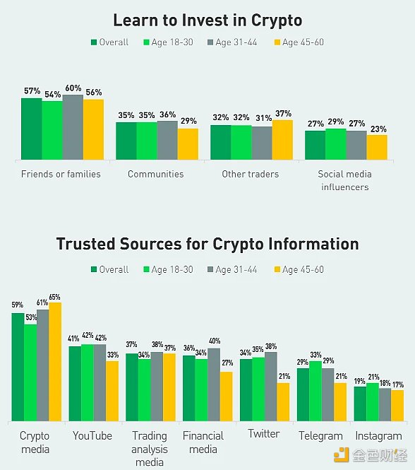 最后,社交媒体产生了重大影响, 27% 的受访者将他们进入加密世界的原因归咎于 KOL 带动。关于获取信息的来源,加密投资者(尤其是年轻群体)主要借助:YouTube(41% )、X 推特(34% )、Telegram(29% )、Instagram(19% )。