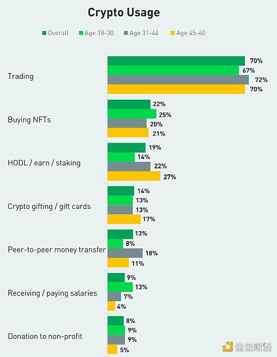 22% 的人使用加密货币购买 NFT。19% 的人持有和质押,这表明有相当一部分人将加密货币视为产生被动收入的手段。数据还显示,随着年龄的增长,从事持仓、赚钱和质押的比例趋于上升。这可能表明年龄较大的受访者更倾向于长期投资策略。