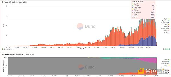 Banana Gun是一款TG交易Bot,最出名的功能是狙击开盘,从最新数据来看(图1),香蕉的用户数以及交易量和 @TeamUnibot 接近,而龙头 @MaestroBots 近期暂无发币计划,香蕉和Unibot的龙二之争愈演愈烈。