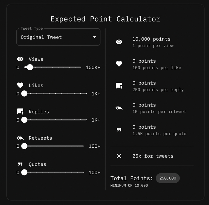 — Original Tweet:发布带有@Tip Coineth $tip 的原创推文,积分倍率 25,初始积分(发了就有)10000,随后根据推文阅读、点赞、回复、引用以及 RT 分别进行相应的积分加成。每天有 5 篇原创推可以获得积分。