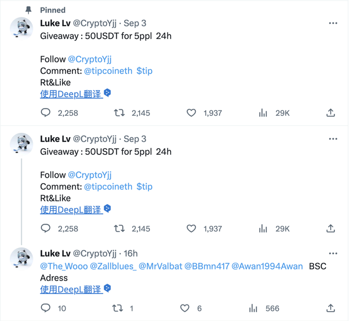 2.使用「钞能力」:由于目前距 Tip Coin Epoch1 结束还有一段时间,同时 Tip Coin 官方也并未公布代币经济学模型,因此对于绝大多数人来说,Tip Coin 能带来的「利润」以及 tip 代币价值几何都是未知数。那么对于没有粉丝基础的 Twitter 用户来说,除去每日任务的固定所得,流量吸引部分就得拿出点「诚意」,通过「真金白银」换取评论、点赞和转推。这也是目前榜单第三位@CryptoYjj 采用的策略——每 24 小时挑选 5 名评论区幸运观众发送 50 USDT。要知道前两位用户粉丝体量分别是 1.9 万与 3.9 万,第三名用户粉丝量仅有 1353,相差几十倍的粉丝体量下,可以将积分保持在几乎持平的水准,可见「有钱确实可以为所欲为」。