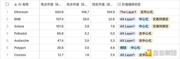 本文想从搭建一个估值模型的角度去看看一条 Layer2 公链代币的估值。要估计 Layer2 的价值,需要从 Layer1 的角度看现在的 Layer2。下图是上个周期主流 Layer1 的高点市值以及现在的市值。