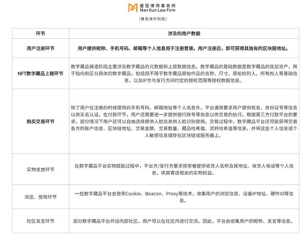 在不同的使用场景下,数藏平台对用户数据进行采集、使用、存储和共享也不同。我们汇总了不同环节主要涉及的数据: