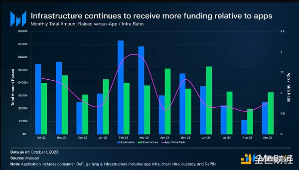 过去一年的另一个值得注意的趋势是,相对于面向用户的应用程序,基础设施项目获得了更多的资金支持。通过将消费者、DeFi和游戏领域分类到“应用程序”中,将应用基础设施、公链基础设施、托管和DePIN领域分类到“基础设施”中,最好地展示了这一点。