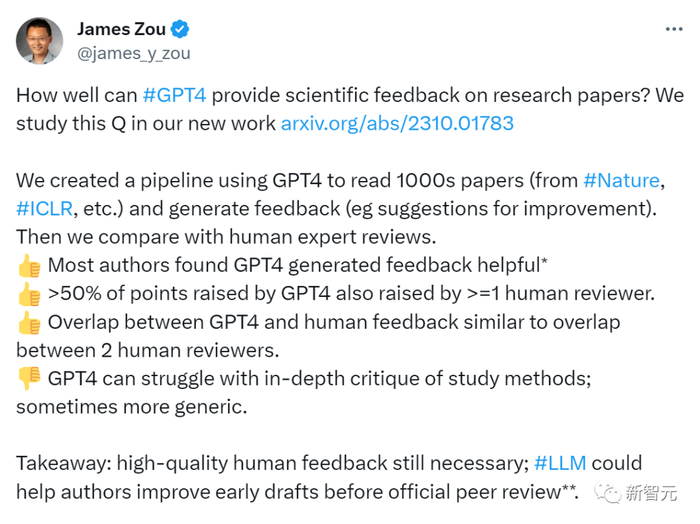 论文作者James Zou总结道:我们仍然需要高质量的人工反馈,但LLM可以帮助作者在正式的同行评审之前,改进自己的论文初稿。