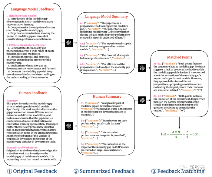 两阶段评论匹配管线会分别提取出LLM和人类反馈中的评论点,然后执行语义文本匹配,来匹配LLM和人类反馈之间的共同评论点。