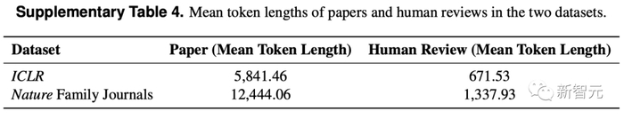 在Nature和ICLR两个数据集中,论文和人类评论的平均token长度分别如下。