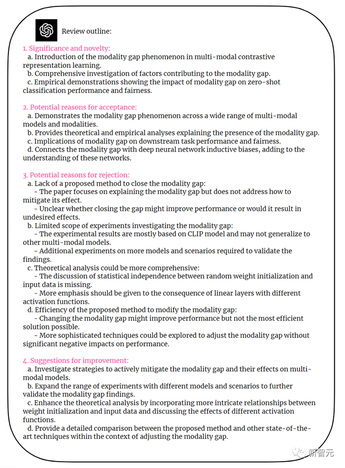 GPT-4一针见血地指出:虽然论文提及了模态差距现象,但并没有提出缩小差距的方法,也没有证明这样做的好处。