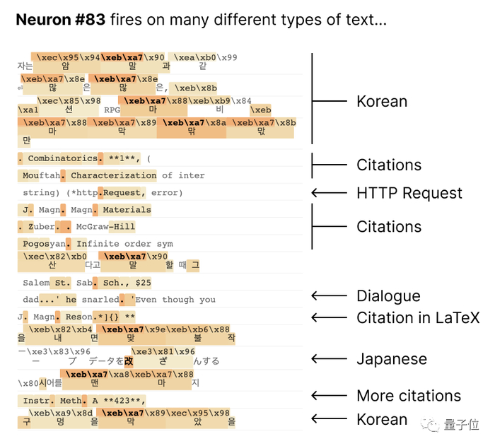 例如,一个小型语言模型中的某个神经元会同时对学术引文、英语对话、HTTP请求、韩语文字等不同内容表现出强烈的激活状态。