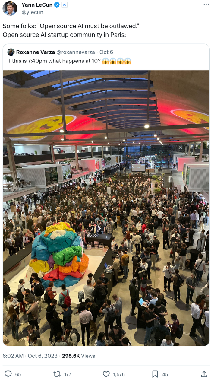 目前,Meta 尚未对此发表任何评论。不过,Meta 首席 AI 科学家 Yann LeCun 似乎对「开源 AI 必须被取缔」这一说法进行了回应,晒出了巴黎开源 AI 创业社区的盛况。
