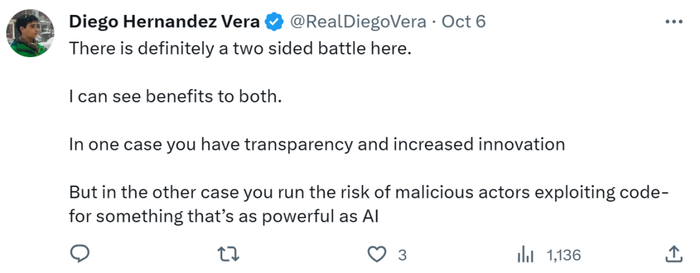 有网友表示,开源有利有弊,既可以让人们获得更高透明度并增强创新,但也将面临恶意行为者滥用(如代码)的风险。