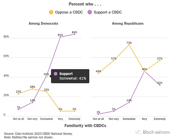 美国2023年CBDC全国调查,黄色表示反对,紫色表示支持。图中显示,民主党人更倾向支持CBDC,共和党人更倾向反对CBDC。