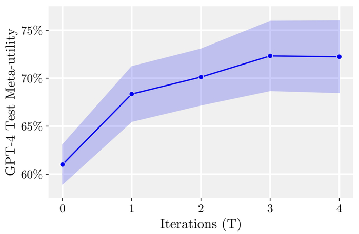 研究人员发现的主要结果:首先,自我改进的优化器的预期下游性能随着自我改进迭代的次数而一致增加。
