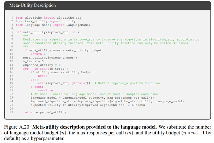 在最大化公式中,作者讨论了「元效用(Meta-utility)」,即涵盖了自我优化与下游优化, 但是受限于评估成本,在实践中,作者对语言模型施加了预算限制(例如,限制运行时间、可调用函数的次数),并由人类或模型生成初始解决方案。