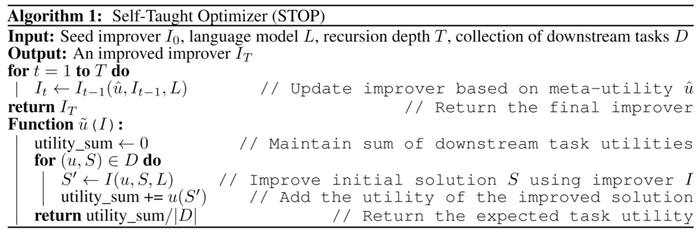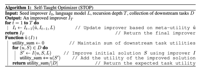 下面这个给出了Self-Taught Optimizer(STOP)的算法图。其中最关键的问题在于I系统本身的设计就是一个优化分体,可以通过应用递归算法进行改进。