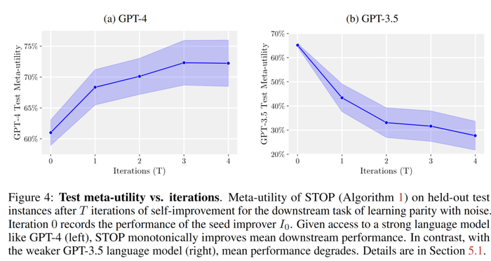 在自我改进T次后,STOP在带噪声奇偶校验的下游任务中的保留测试实例上的「元效用(Meta-utility)」。