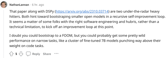 也许通过这种方法,即便不能通向AGI,但也许能够在限定范围的任务上,让专门优化过的模型获得比自身原本性能高得多的表现。