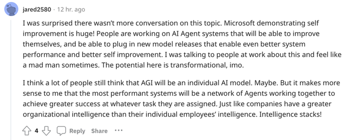 网友认为,这篇论文提出的方法潜力非常巨大。因为未来的AGI可能不是一个单个的大模型,很有可能是由无数高效的智能体组成的集群,智能体能够共同努力,在分配给他们的巨大的任务上取得成功。