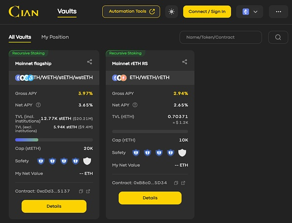 CIAN Protocol 是一个专注于提高 LST 代币收益的自动化金库策略协议,目前拥有 ETH Matic Avax 币本位的多个策略金库。