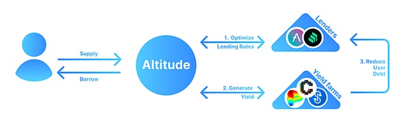 Altitude 是一个自动化借贷管理工具,目标是解决当今借贷项目普遍资本效率低的问题,自动化管理借贷头寸,将过剩的抵押品存入农场协议中赚取年化,而当抵押品下跌时自动存农场中提取存入借贷平台避免清算。