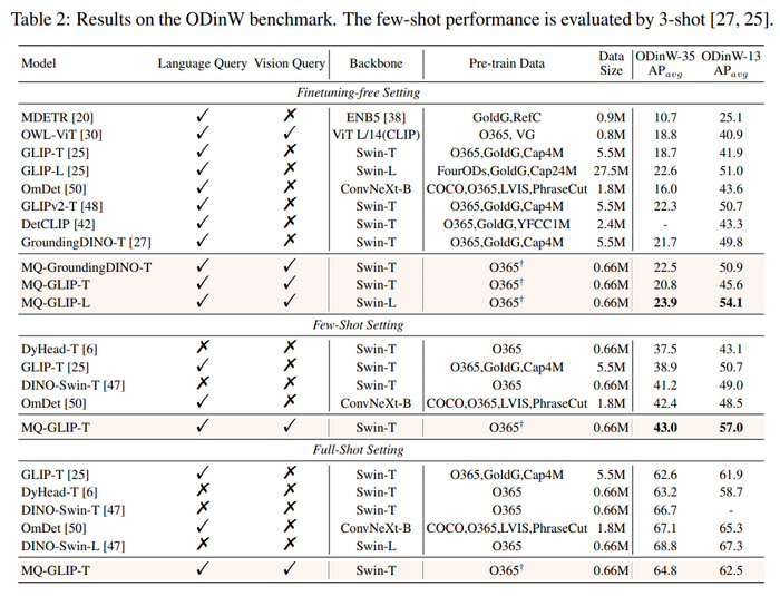 作者还进一步在下游35个检测任务ODinW-35中进行了全面的实验。由表2可以看到,MQ-Det除了强大的finetuning-free表现,还具备良好的小样本检测能力,进一步印证了多模态查询的潜力。图2也展示了MQ-Det对于GLIP的显著提升。