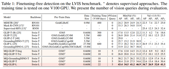 在文章中,作者分别将MQ-Det的结构设计和训练技术应用于目前的SOTA模型GLIP[1]和GroundingDINO[2],来验证方法的通用性。
