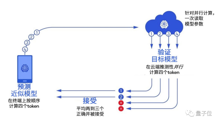 由于小模型生成速度比大模型快好几倍,一旦大模型觉得小模型已有的词可用,就直接拿来,不用自己再缓慢生成一遍。