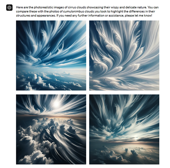 例如,我正在为科学课做一份关于卷云的报告,需要一些逼真的图像来展示它们的纤细形态。同时需要与浮肿积雨云的照片进行比较。