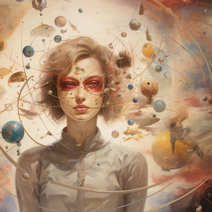一个巨大的观察眼睛,虹膜错综复杂,瞳孔与向日葵类似。深邃而黑暗的瞳孔出现在向日葵的中心,周围的金色虹膜图案与花瓣相映。